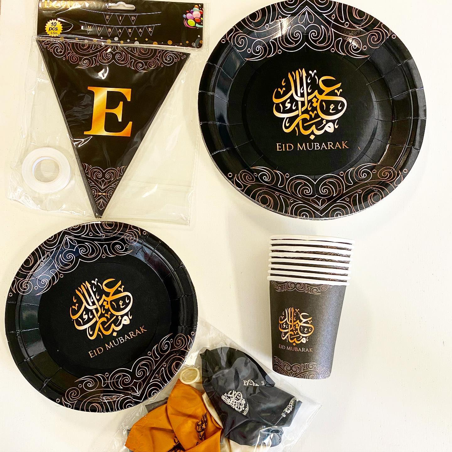 Eid Decoratie Set – Zwart Een setje met verschillende ‘Eid versieringen om je huis mee op te vrolijken!Elk setje bevat de volgende items: Vlaggen set. Op elke vlagje vind je een letter. Deze spellen samen: “Eid Mubarak” 8 Bekers 8 Bordjes 8 Dessert bordjes 12 Ballonnen in gemixte kleuren: Wit, Zwart, goudbruin en zilver.