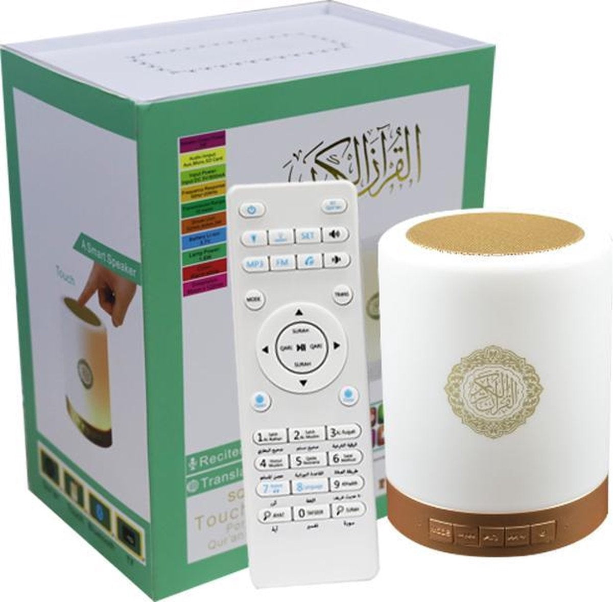 De  Koran Lamp is de meest flexibele lichtbron die je je kunt voorstellen. Je kunt de lamp overal plaatsen. Verlicht bijvoorbeeld grotere oppervlakten met zacht, stijlvol indirect licht. De  Koran Lamp levert 7 kleuren en wittinten. Je bedient de lamp vanuit je luie stoel met de app op je smartphone of de afstandsbediening, waarmee je de verlichting kunt in- en uitschakelen of dimmen. Maar ook met de hand.De lamp heeft 25 talen en is dus door een ieder te gebruiken. Daarnaast heeft de lamp de volgende functies Sahih Boekhari Sahih Muslim Tafsier Hisnul Muslim(Dua) Hajj en Umrah rituelen Al-Roeqyah Koran Bluetooth Radio 360 graden licht RGB Lamp Tijdschakelaar time off Touch Key Inhoud Doos: Koran Touch Lamp Afstandsbediening Handleiding Lader